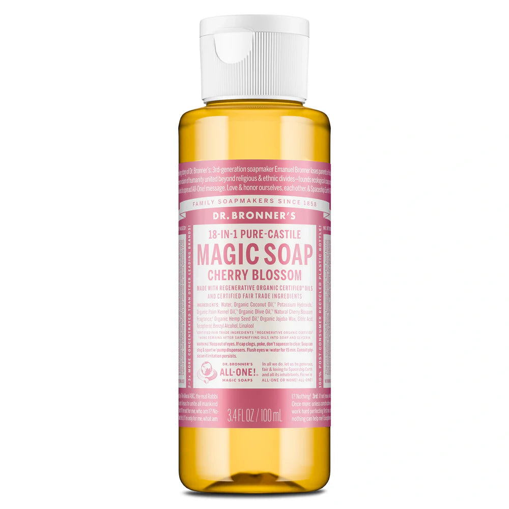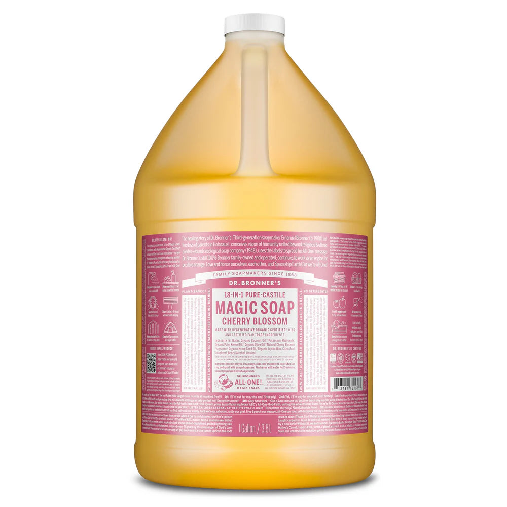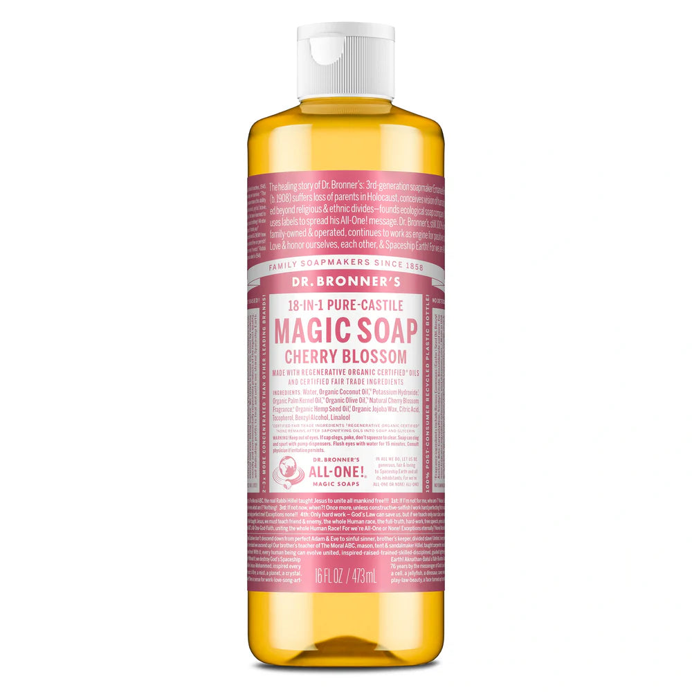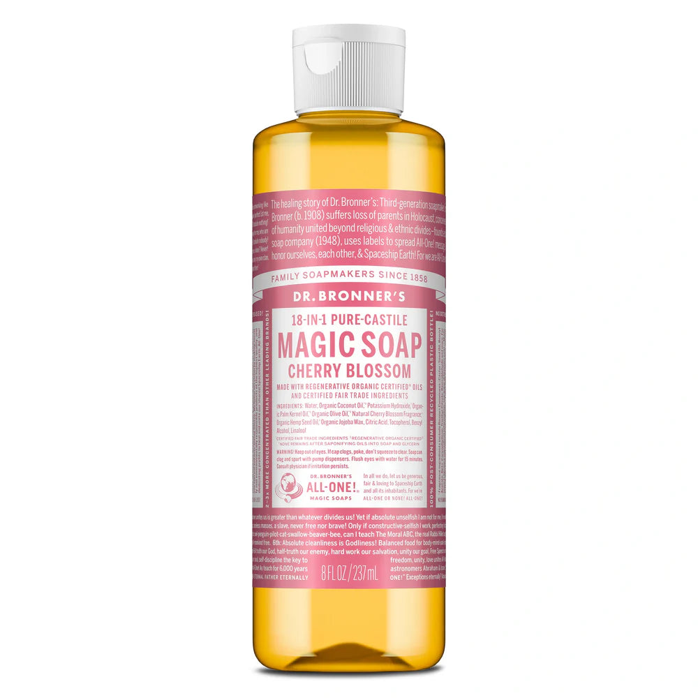 Cheerful & bright, with fruity, floral notes—Dr. Bronner’s Cherry Blossom Liquid Soap delivers a mindful, fresh reset for the spring! Made with Regenerative Organic Certified® oils, this true soap creates a rich, smooth lather that leaves you feeling renewed and rinses clean. Made with organic, ethically sourced ingredients and no detergents, dyes, or added foaming agents, it’s a great soap for everyday use. Vegan, made with organic oils, fair trade, and EWG Verified®—a clean that cares for you and the planet!